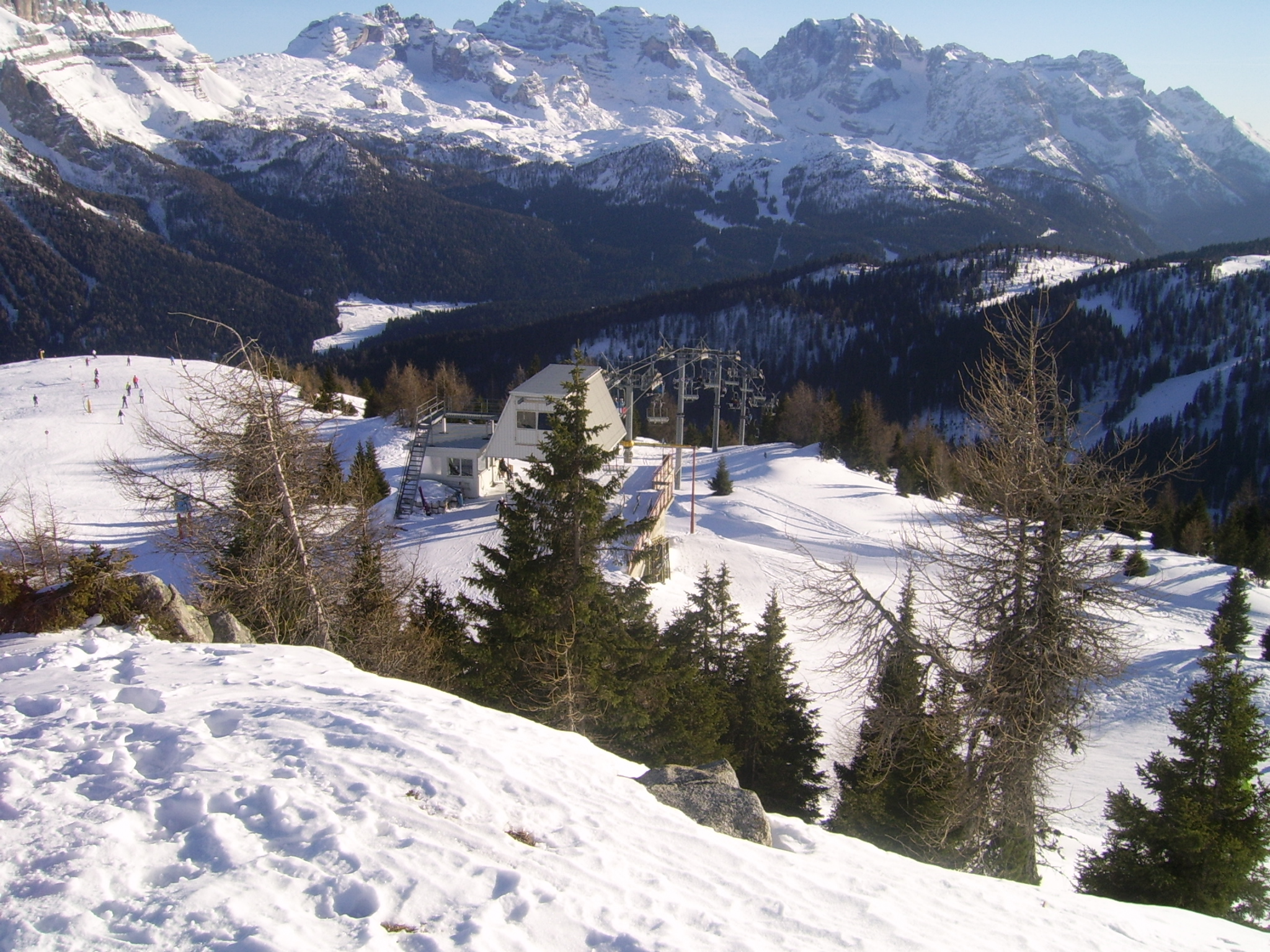 Seggiovia Malghette, che collega Madonna di Campiglio a Marilleva. Sullo sfondo il passo Grostè e la valle