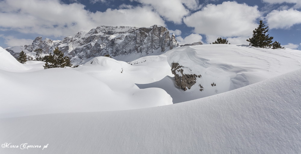 foto durante una ciaspolata al Passo Sella con il gruppo del Sella sullo sfonfo